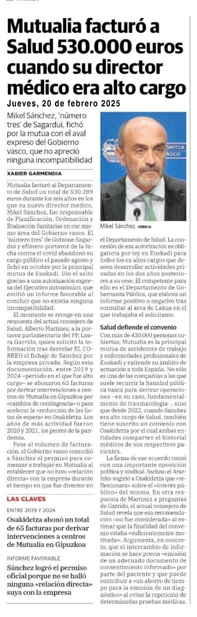 Alberto Martínez Osasun sailburuak ez du egia esaten itxaron-zerrendei buruzko adierazpenetan, espezialitate batzuetan batez besteko itxaronaldia 57 egunekoa dela baieztatuz, baina errealitatean, askotan hilabeteak edo urtebete baino gehiago luzatzen dira. Era berean, osasun pribatura bideratutako derivazioak murriztu direla dioten arren, helburu horretarako aurrekontua %11,5 handitu da 2025ean.