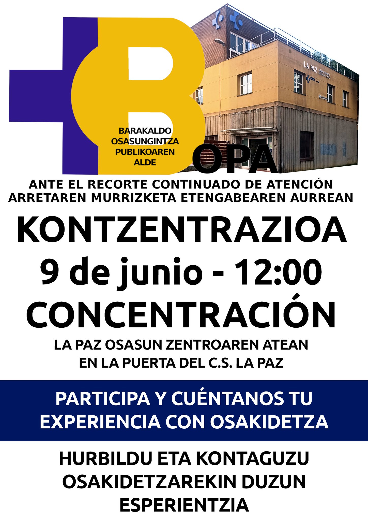 OPA Herri Plataformak koordinakundean bildutako herri plataformek, hainbat erakunde sozial eta sindikalekin batera, dei egiten diete herritarrei apirilaren 22an, larunbata, Bilbon, Donostian eta Gasteizen Osasungintza Publikoaren alde egingo diren manifestazioetan parte har dezaten. Aukera bat da guztiok bat egiteko eta Eusko Jaurlaritzari, EAJri eta PSEri exijitzeko murrizketen politika geldiaraz dezatela eta 180 graduko bira eman dezatela Osasungintza Publiko duin eta kalitatezko baterantz.