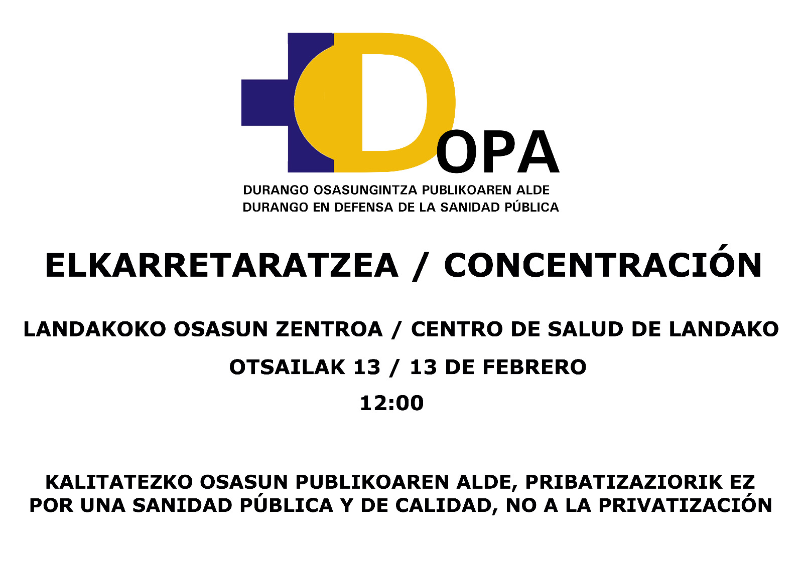 Para reivindicar la creación de ese nuevo modelo sanitario que proponemos, la coordinadora OPA Herri Plataformak, junto con todos los agentes sociales que deseen adherirse a este manifiesto, convocamos a la ciudadanía a participar en las manifestaciones que se celebrarán el próximo sábado 16 de marzo de 2024, en Bilbao, Donostia-San Sebastián y Vitoria-Gasteiz.